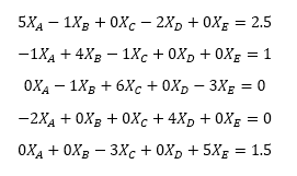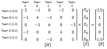 Team A played against Team B once and against Team D twice. Winning all three of its games, Team A's record is 3-0. Team B lost to Team A once, and won once against Team C for a record of 1-1. Team C lost against Team B and played Team E three times. Of the three times Team C faced Team E, Team C won once and lost twice. Team C's record is 1-3. Team D's record is 0-2 with the two losses to team A. Team E only played Team C, so its record is 2-1. The matrices M and B are calculated from these records and the system of equations can be expressed below: