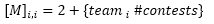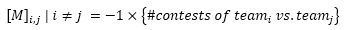 In M, the diagonal entries represent the total number of contests that team i has completed, plus 2 to assume every team starts out as an average team (one win and one loss). This assumption is important in defining the nature of the matrix. The equation for diagonal entries is: