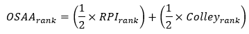 A team's overall OSAA rank is determined by an equally-weighted average of their RPI and Colley ranking (see #3 above). In the event of a tie of this average, the better ranked Colley team is ranked above other tied teams. This overall rank is not calculated from component ratings of the two separate ratings systems. Ratings are only used for a relative comparison within the same system to determine the placement (rank) of teams within that system.