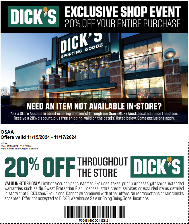 Dick's Sporting Goods is a constant supporter of the OSAA, the OSAA Foundation and schools throughout the state. Dick's Sporting Goods is the presenting sponsor of the OSAA Weekly and provides three seasonal discounted shopping dates in store for anyone involved with the OSAA. Dick's Sporting Goods is one of the nation's leading sporting goods retailers. This partnership provides Oregon schools and coaches the ability to find whatever they need for their team in any season. Visit their locations around the state and mention the relationship with the OSAA. Every Season Starts at Dick's Sporting Goods. 2024-2025 Winter Sports Coupon